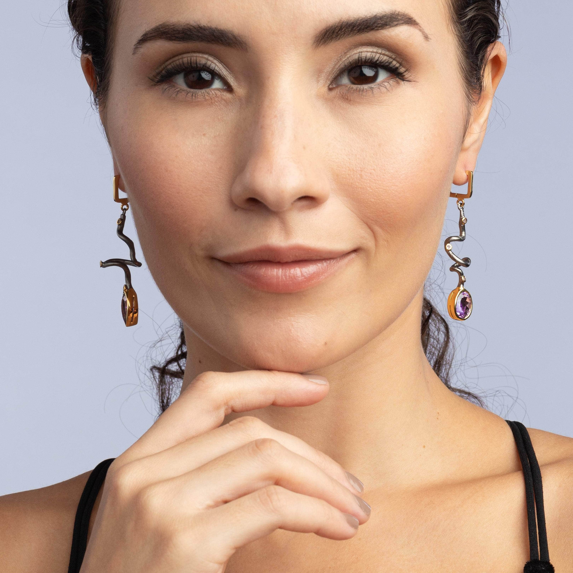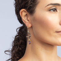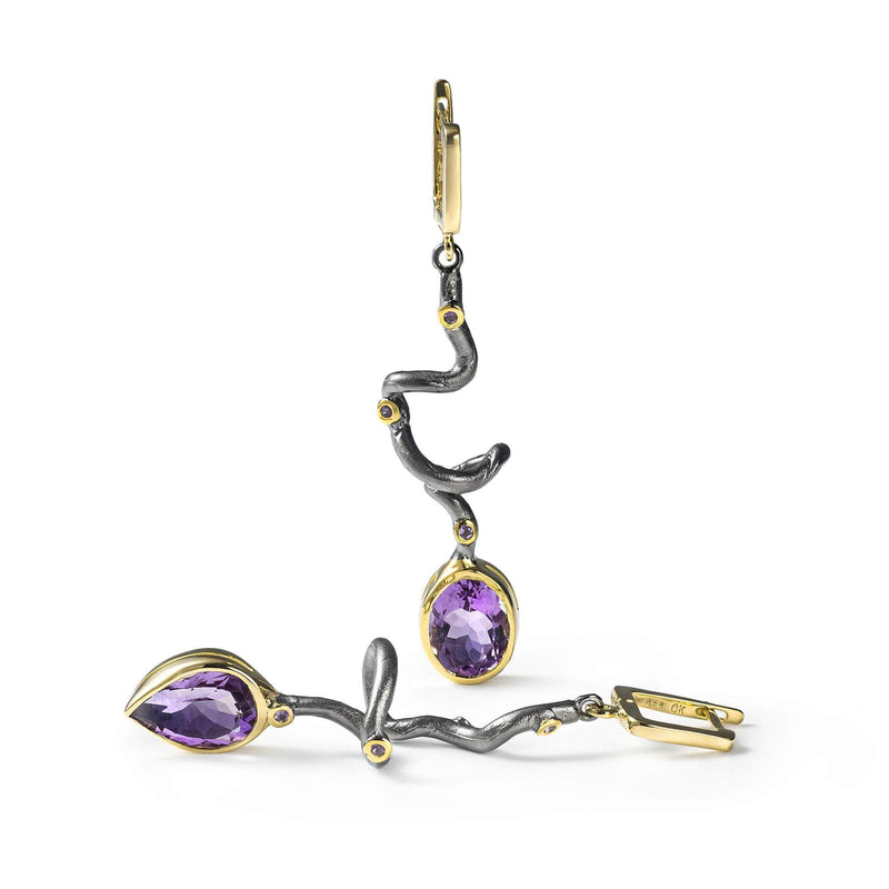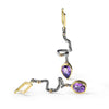 These asymmetric earrings from German Kabirski's Bacchus Bunch Collection showcase one pear-cut and one oval-cut Amethyst, plated in Black Rhodium and 18K Gold. Drawing inspiration from Bacchus, the Roman god of wine, indulgence, and creativity, these earrings capture the essence of both luxury and clarity. Amethyst, linked to Bacchus, is believed to promote mental clarity and tranquility. Ideal for those who embrace life's pleasures while seeking a peaceful mind.