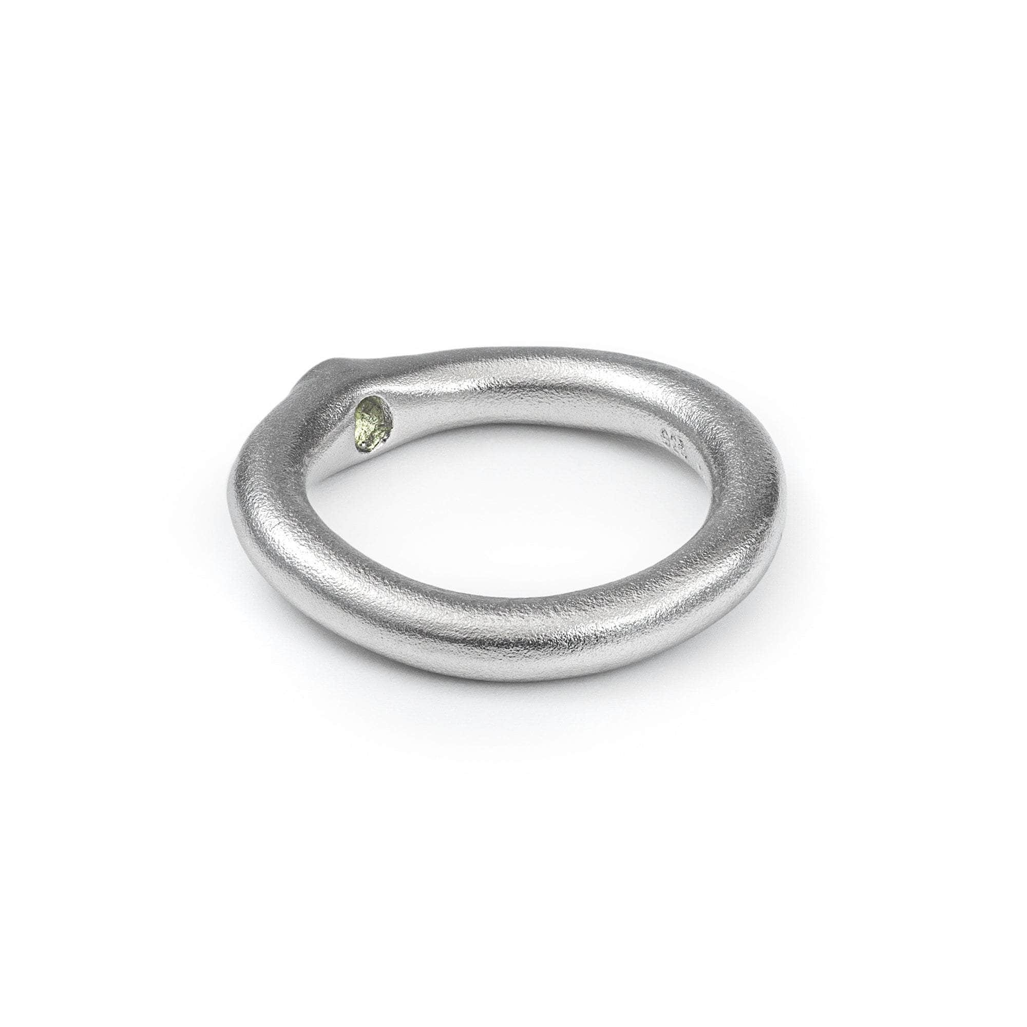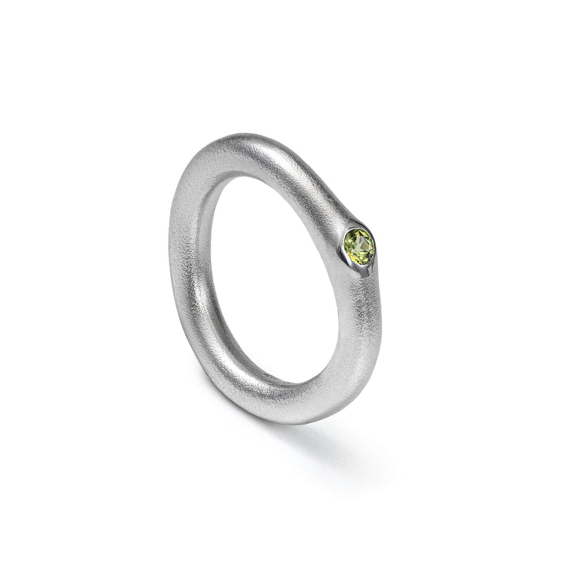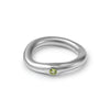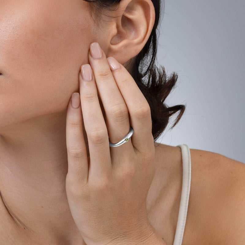 This piece from German Kabirski's Buds and Beans Collection combines a clean, minimalistic design with a vibrant 3mm round-cut Peridot in a natural green hue. Set on a sleek silver band and coated with White Rhodium from the platinum metal family, it offers both enhanced durability and hypoallergenic qualities. Its refined lines make it perfect to wear solo for understated elegance, or layered with other pieces from the collection for a rich, textured look. The collection embraces the unique beauty of natural green gemstones in all their forms.