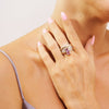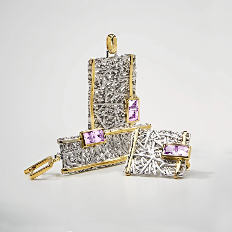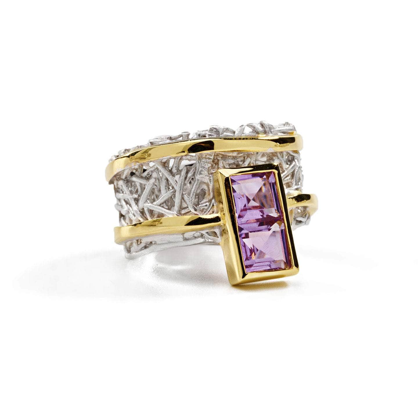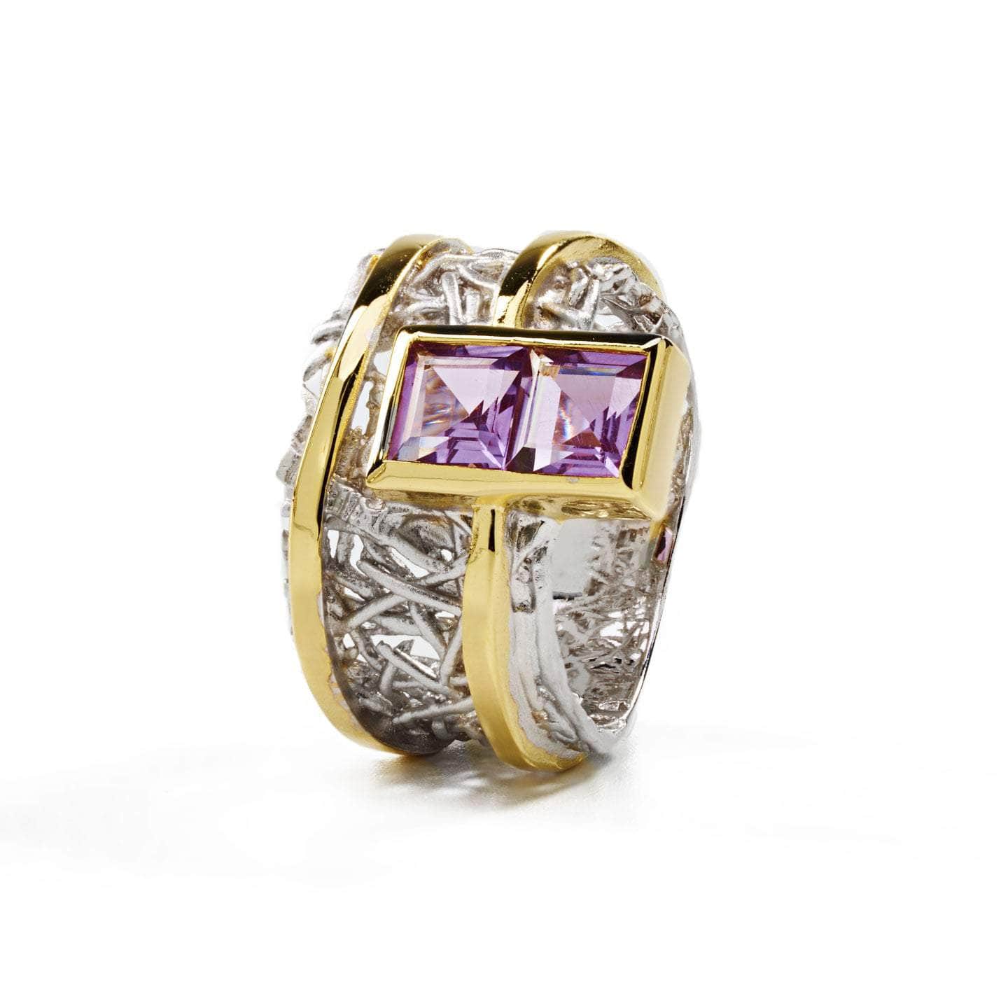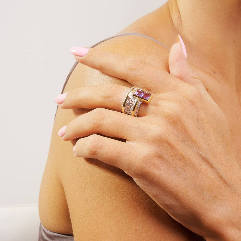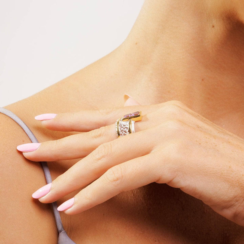 Two elegant gold bands curve gracefully around a white rhodium backdrop, their design inspired by nature's organic patterns, making them irresistibly captivating. At the top, a gold-trimmed gemstone of your choice adds a touch of brilliance. Choose from radiant blue topaz, sparkling amethyst, pristine white topaz, or vibrant green peridot. For the ultimate statement of beauty, pair this Verina Ring with the matching Verina Pendant and Earrings—a stunning set meant to be admired as a whole.