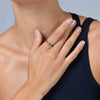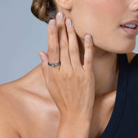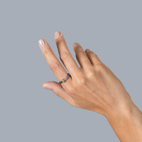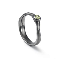 This ring from the Buds and Beans Collection brings a fresh perspective to minimalism with its organic, slightly asymmetrical design. The ultra-thin band, plated in Black Ruthenium, offers a sleek, matte finish that complements its natural form. At the center, a 3.75 mm apple-green Peridot stands out, its vibrant hue contrasting beautifully with the dark band. Ideal for those who find charm in irregularity, this ring is perfect for daily wear or stacking with other pieces for an artfully eclectic style.