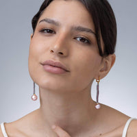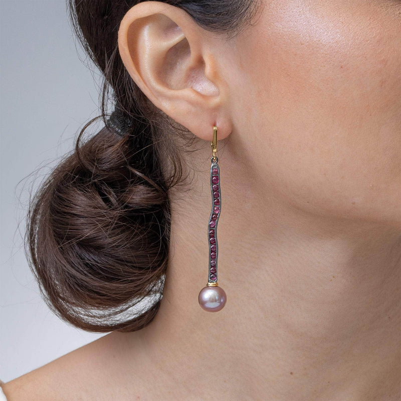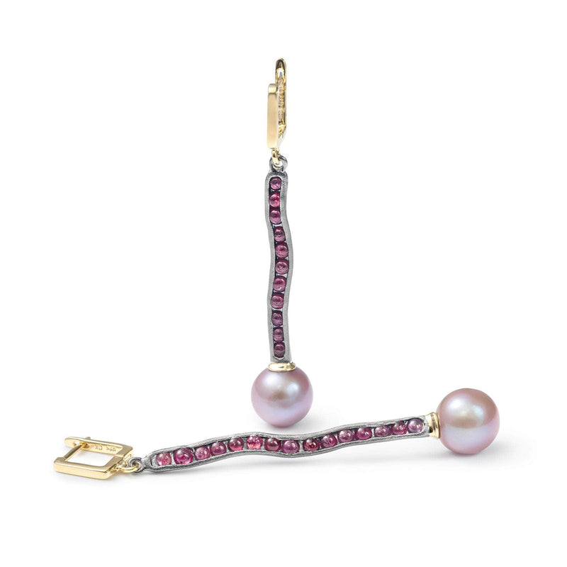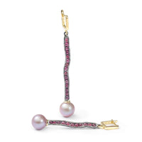These modern, asymmetric earrings from the Freakwater Pearl Collection are crafted by hand using 925 Silver, plated with Black Rhodium and Gold for added durability. Each earring showcases a natural round freshwater pearl alongside a row of ruby cabochons, strikingly contrasting the black rhodium finish and the rubies. Designed for those who value creativity and enjoy making bold fashion statements, these unique earrings offer a distinctive style.