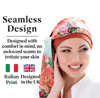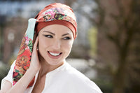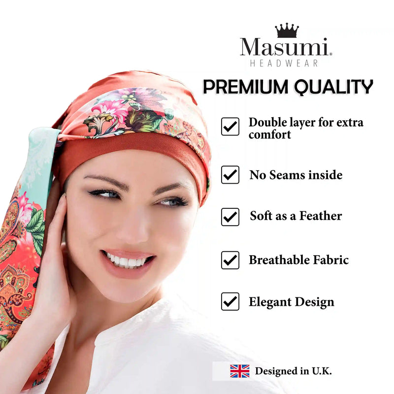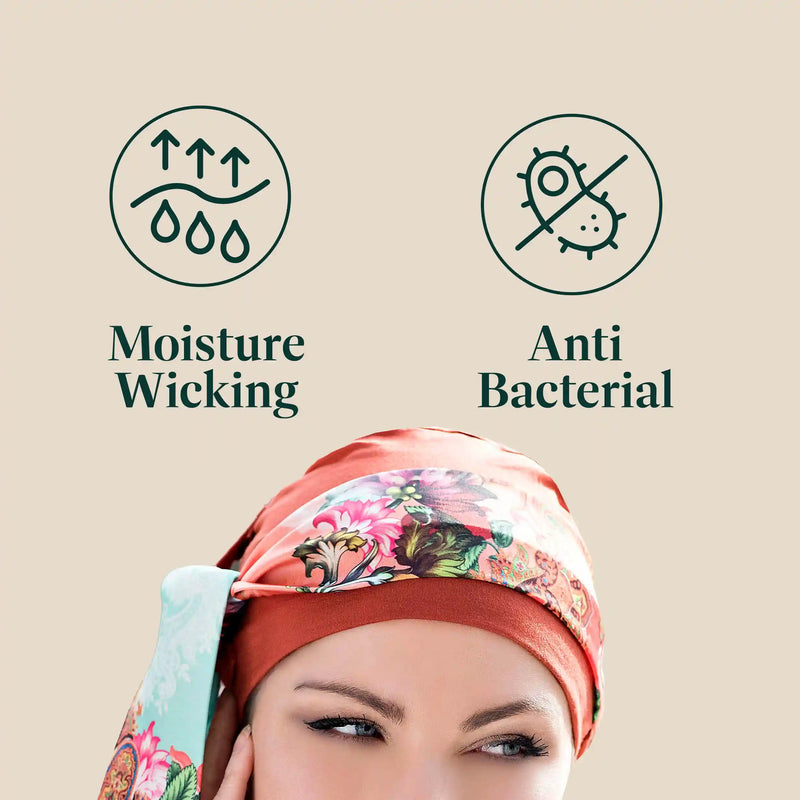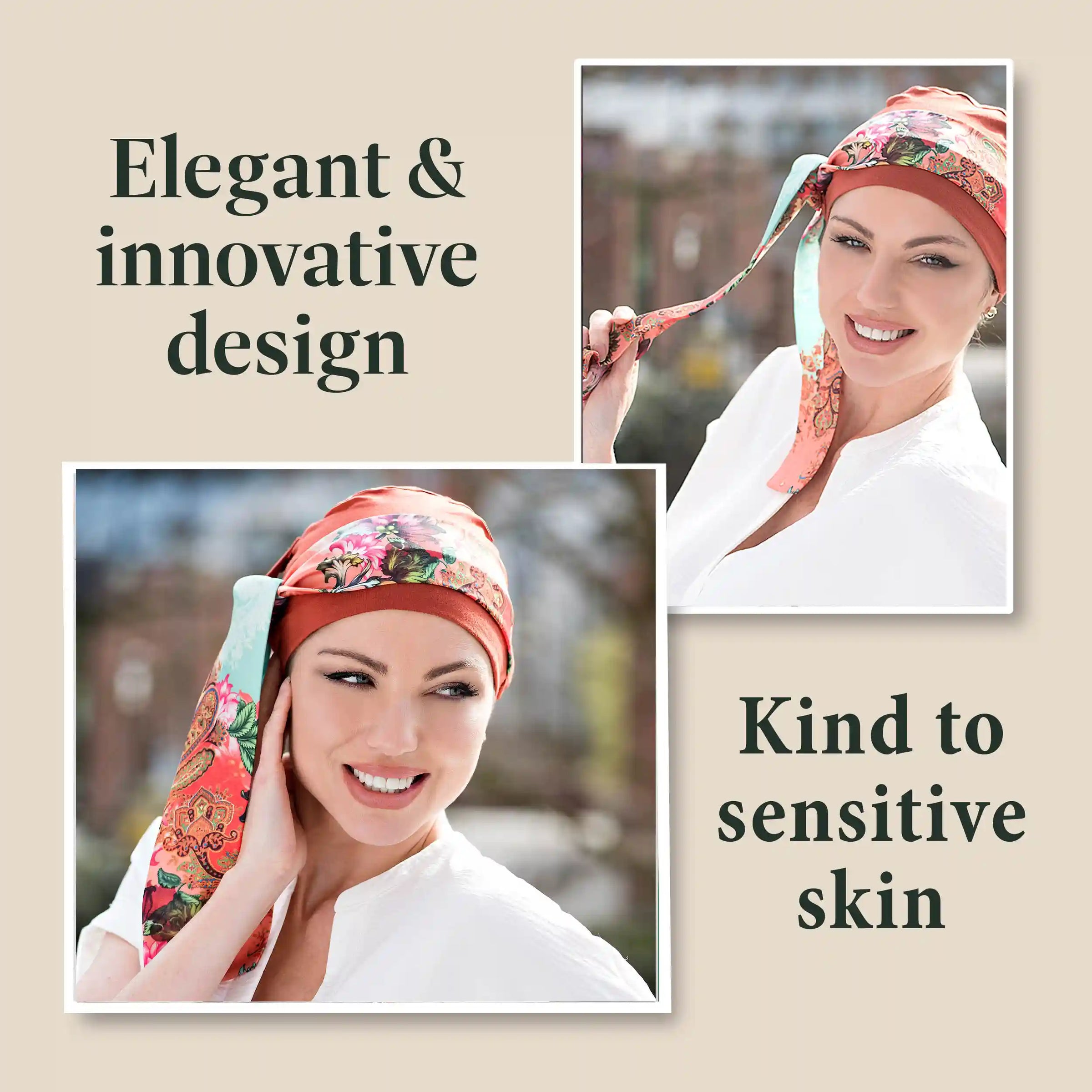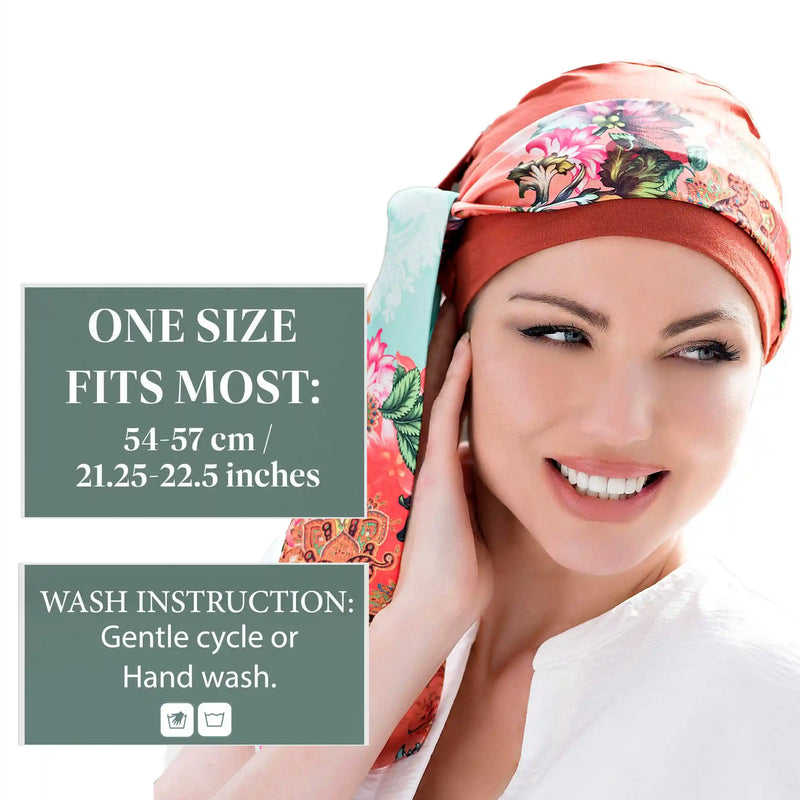 For those in search of a lively chemo headscarf, Yanna Brick Royal Marigold is the ideal choice. This bamboo design features the popular cap and headscarf combination. Notably, its stunning brick cap provides a luxurious feel on the skin and serves as the perfect canvas for the scarf's fresh, floral motifs. These Italian prints boast deliciously warm tones, and the use of baby blue, which accentuates this beautiful contrast.