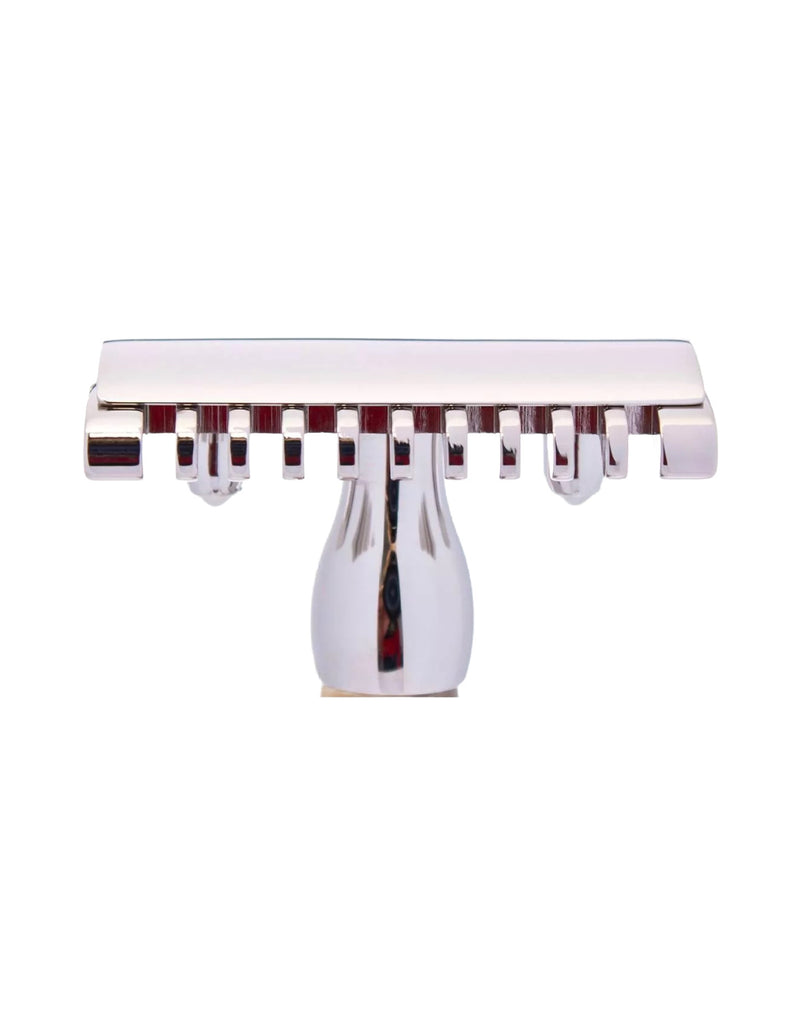 Perfect balance between form and function with this beautiful shaver in white lacquer and brass with a palladium finish.