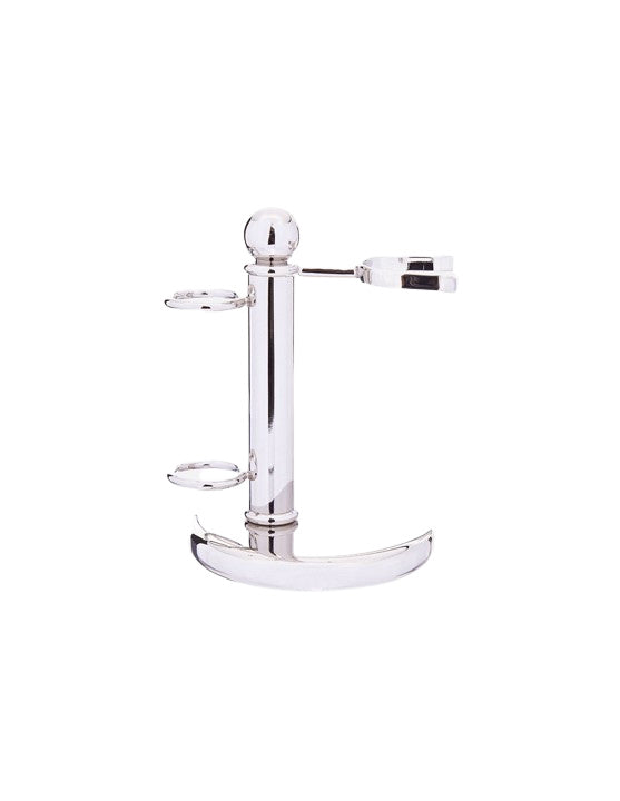 Stylish but discreet design stand for a shaving brush and razor. Made of solid brass with a nickel finish, it has two closed rings, 20 mm diameter, accommodating all the razors from the Plisson collection and many others. The open ring will hold a shaving brush in its upside down position. You can adjust it by tightening or spreading the open ring. Well suited for brushes from size 10 up to size 18, with maximum diameter under the knot not to exceed 26mm. Made in France.